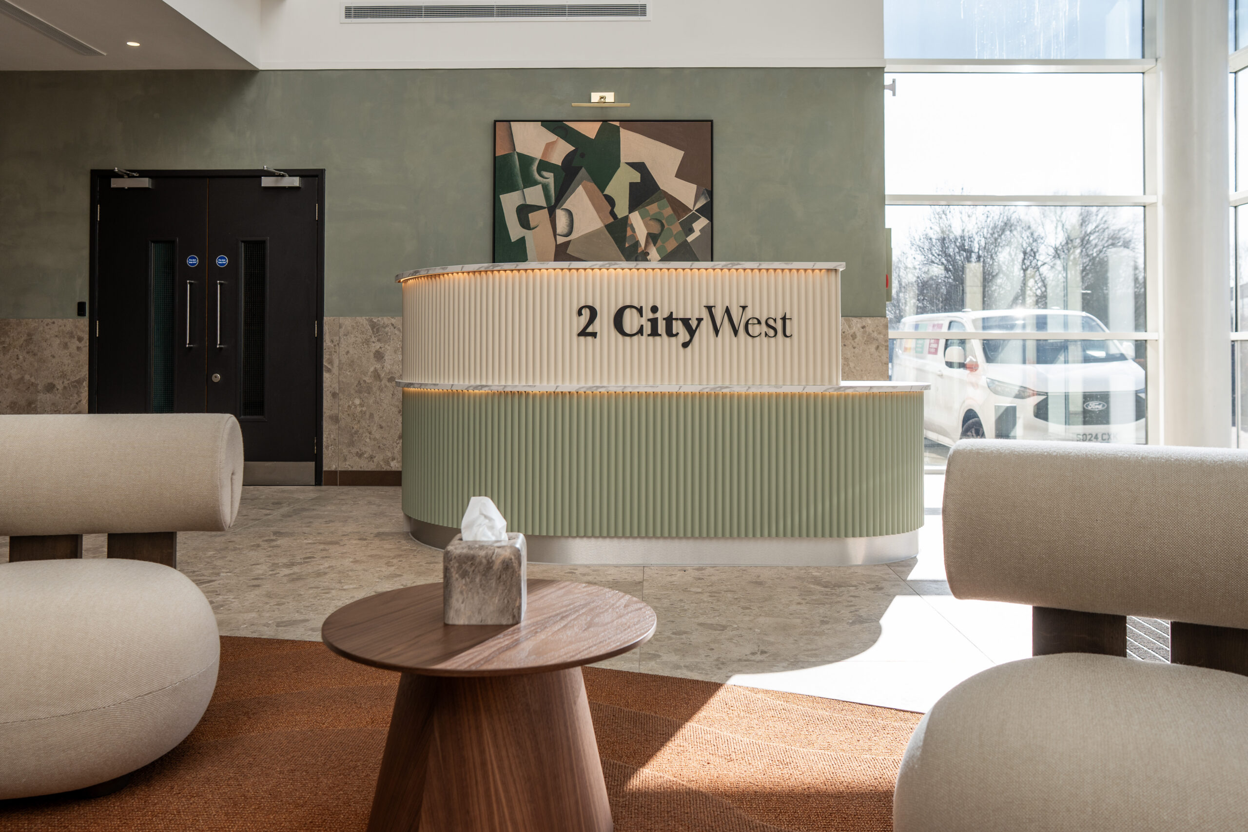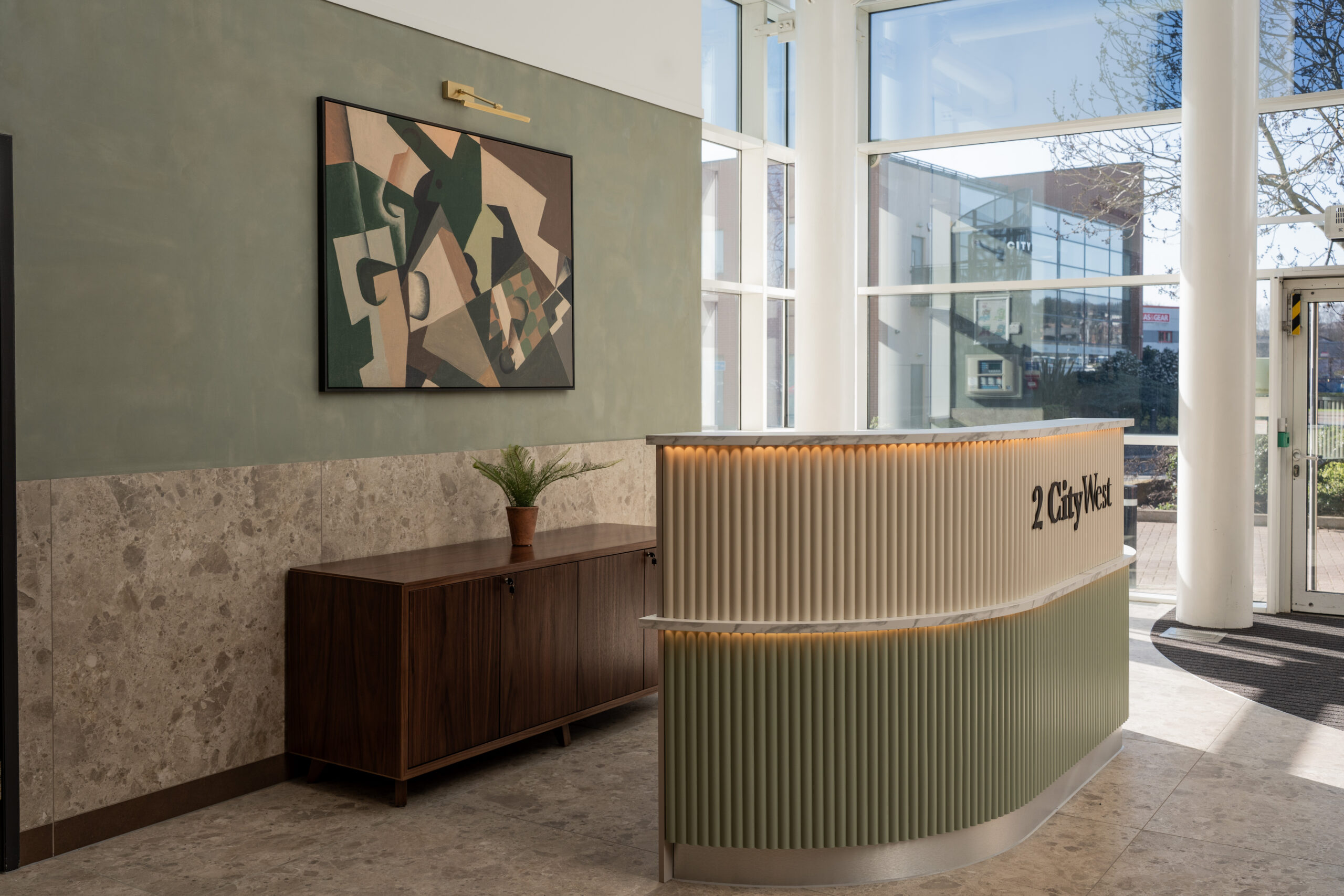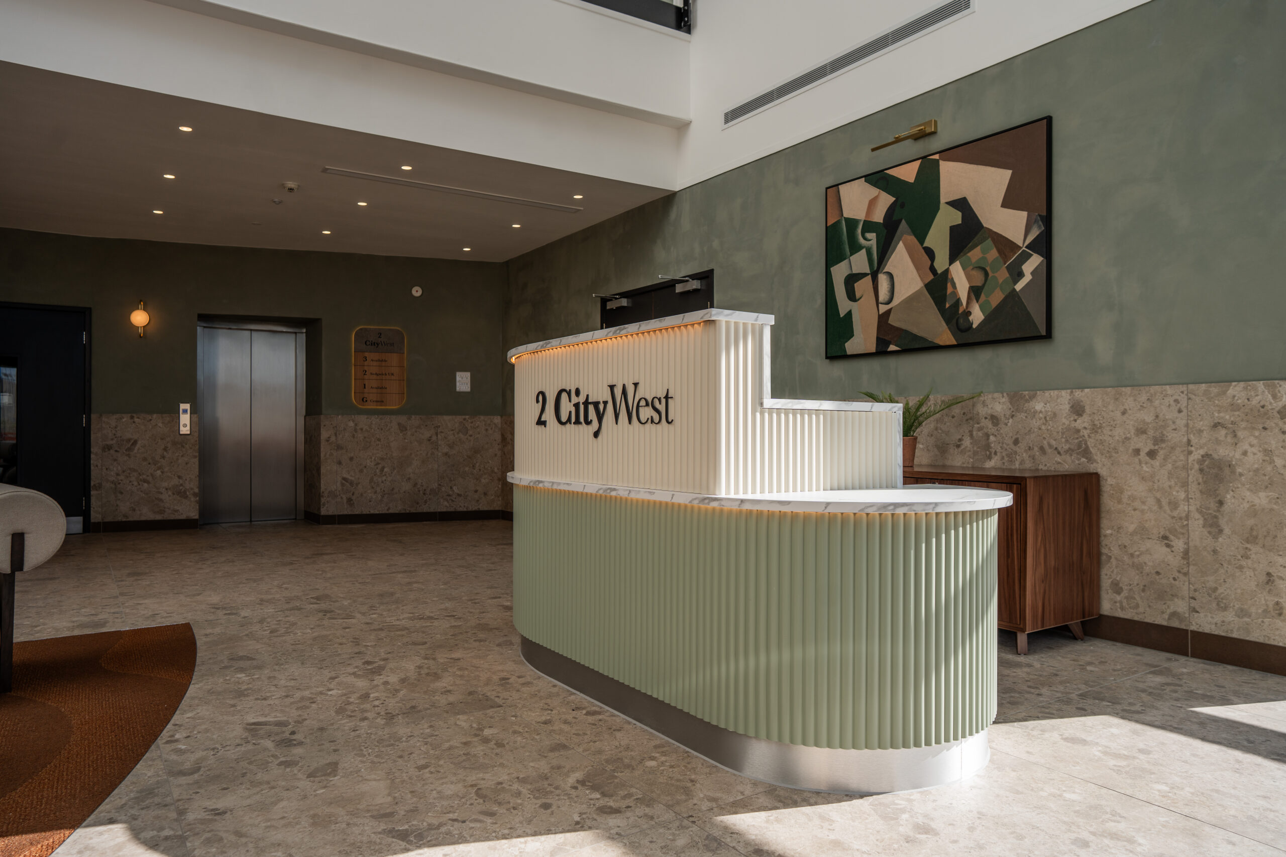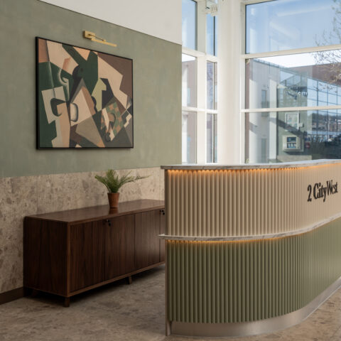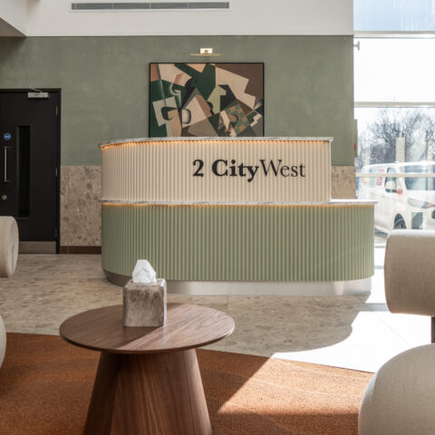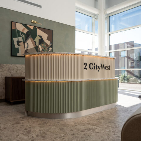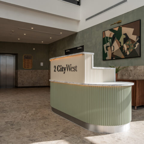 Ben Johnson Interiors were appointed by Davlea Estates to transform the reception at 2 City West into a functional, welcoming space with a boutique, hotel-inspired feel. To deliver a high-impact design, local design specialists Studio 93 were invited to collaborate, bringing their proven track record in creating distinctive interior environments.