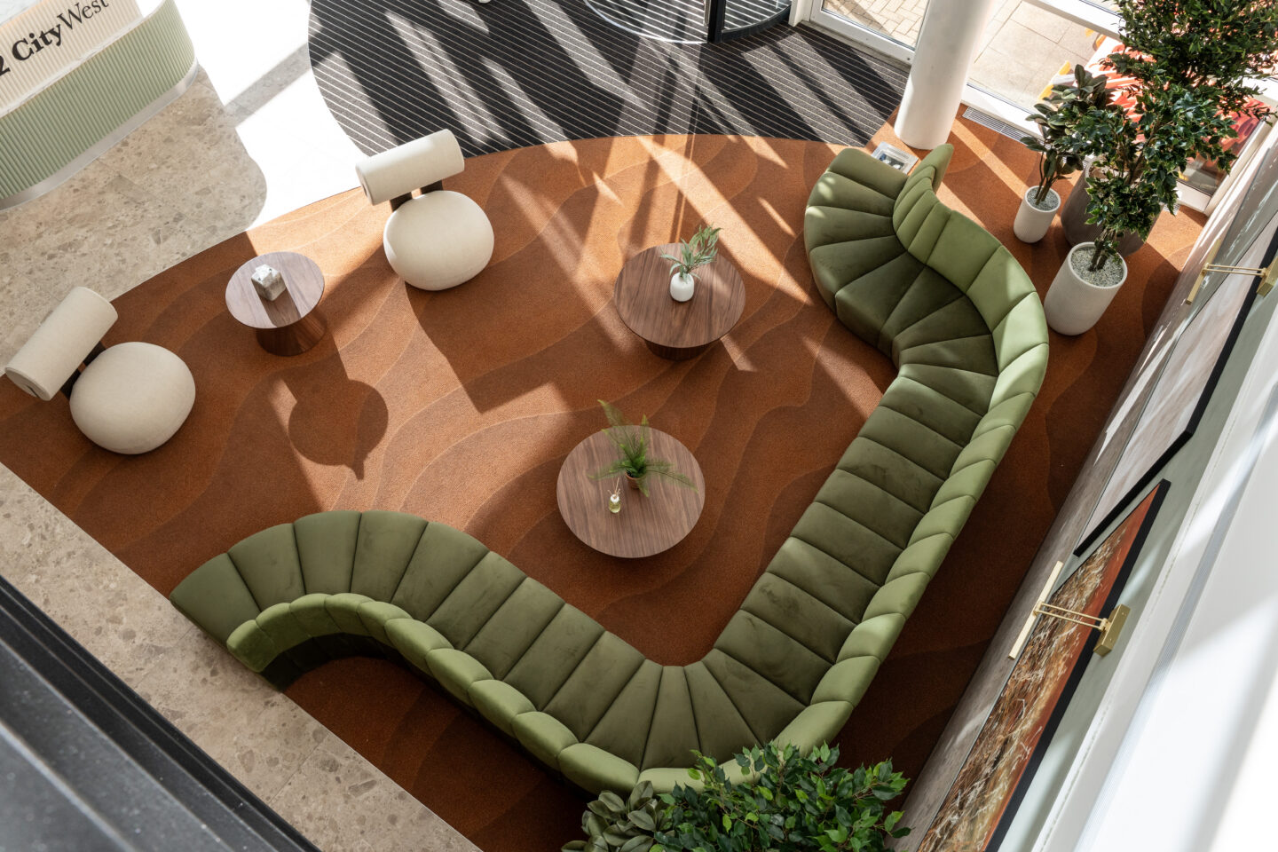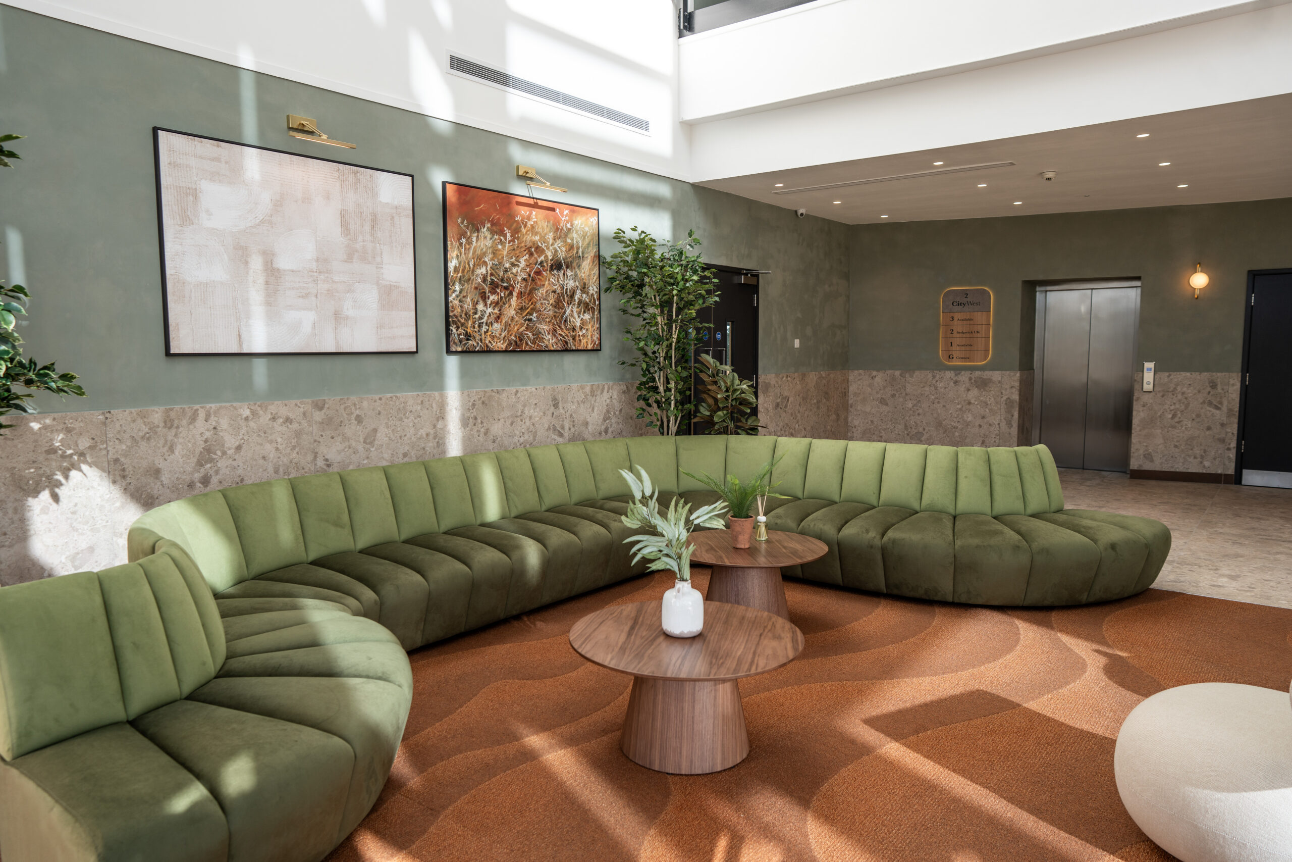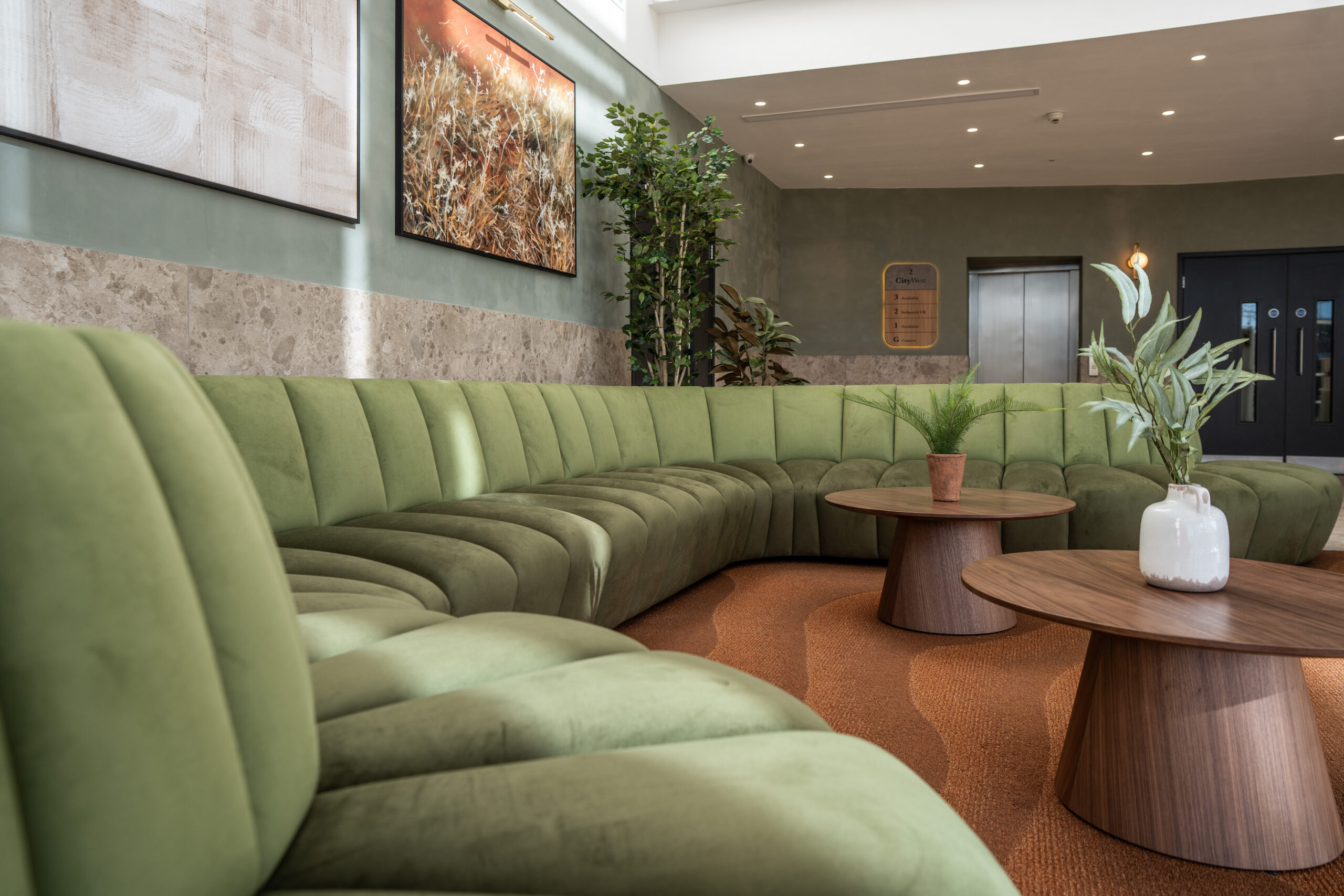 Ben Johnson Interiors were appointed by Davlea Estates to transform the reception at 2 City West into a functional, welcoming space with a boutique, hotel-inspired feel. To deliver a high-impact design, local design specialists Studio 93 were invited to collaborate, bringing their proven track record in creating distinctive interior environments.
