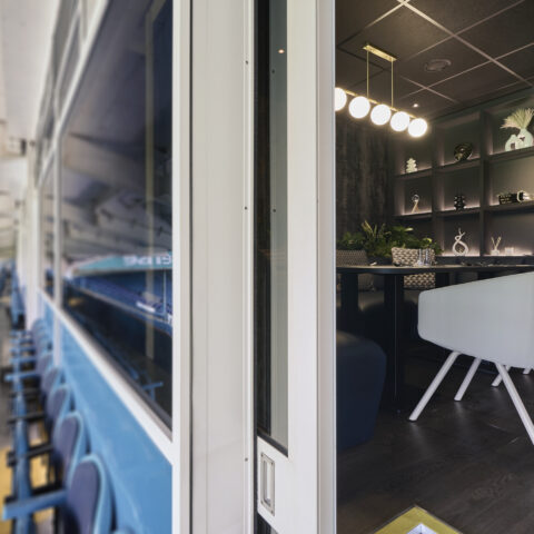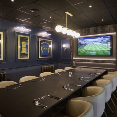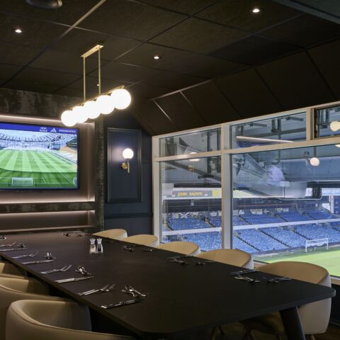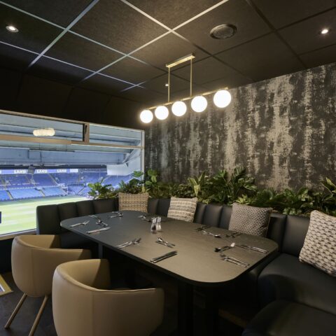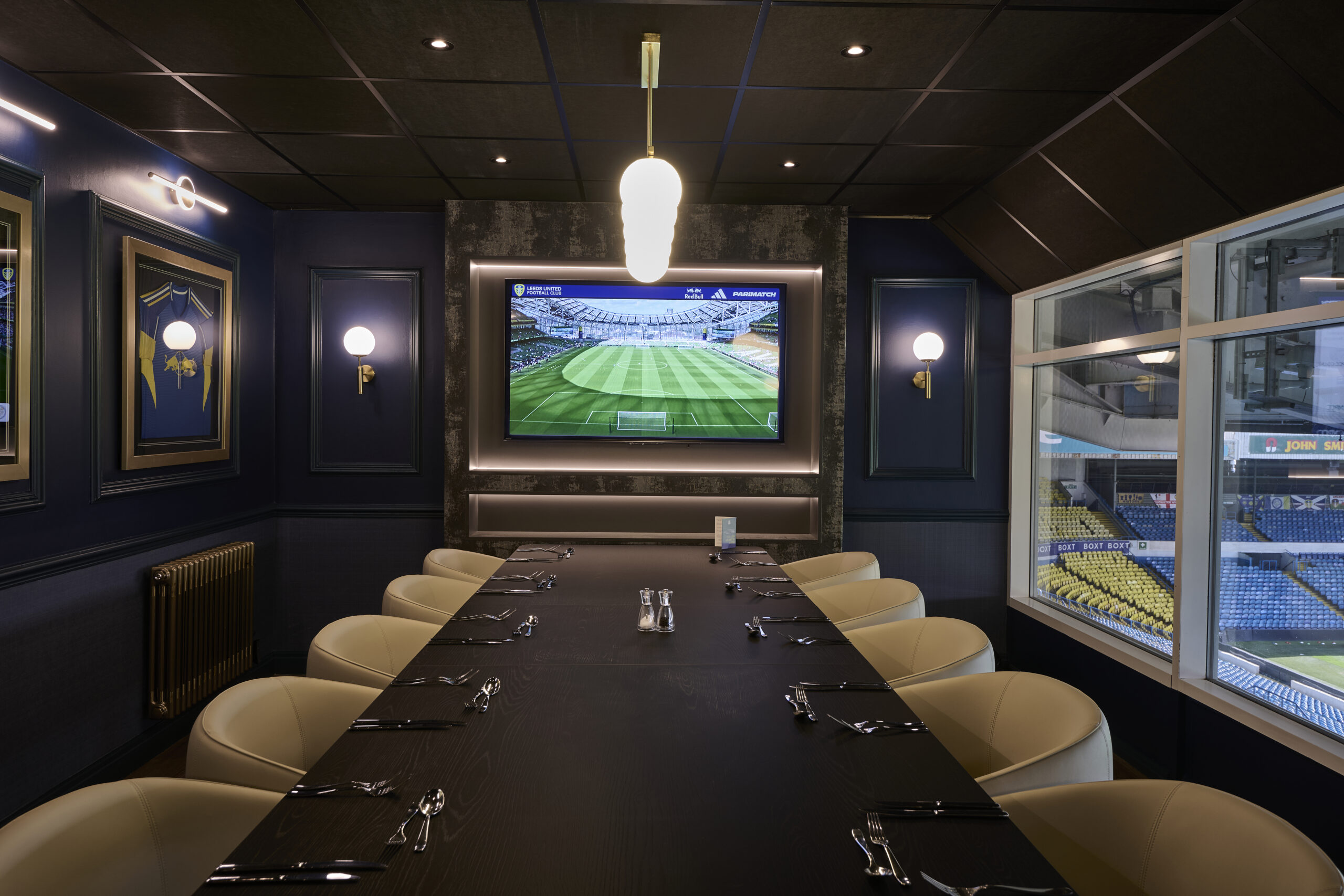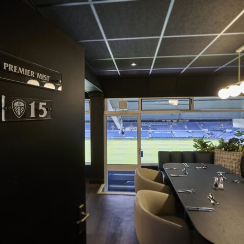Leeds United supporters, Premier Mist had a box at Elland Road for many years. Following Leeds United’s successful promotion to the Premier League, Premier Mist wanted to refurbish their box so that it was a luxury experience for their clients in time for the new football season. The box had last been refurbished in the 1990s: neutral in finish, with a traditional hospitality box set-up of a central dining table and chairs.