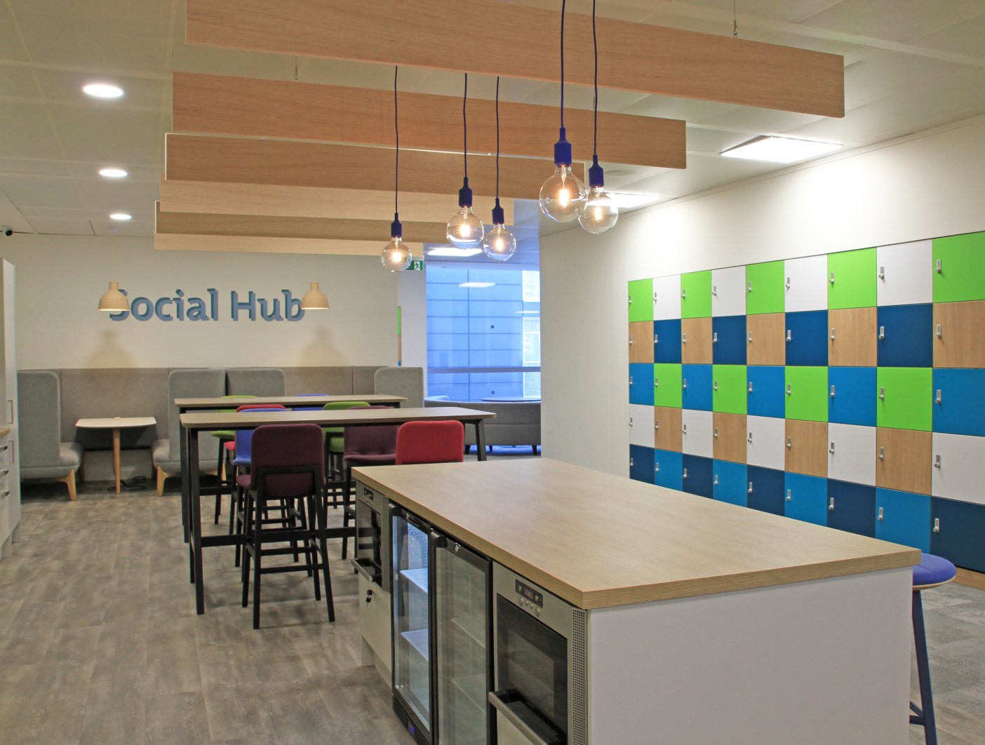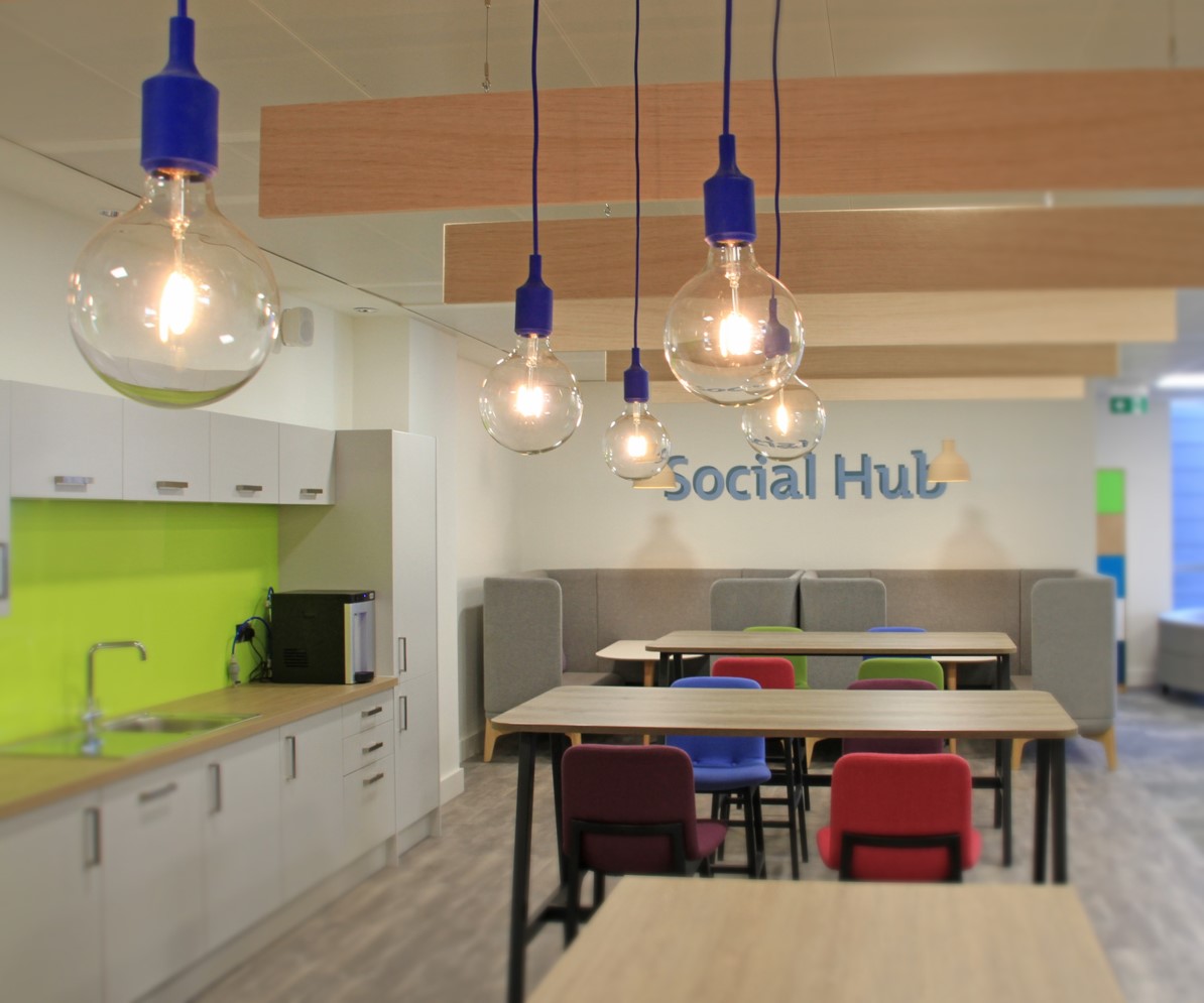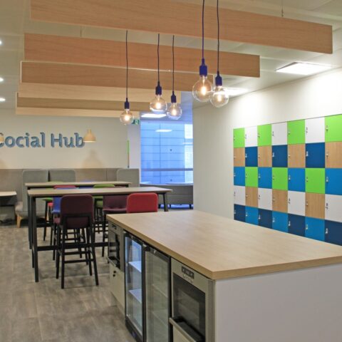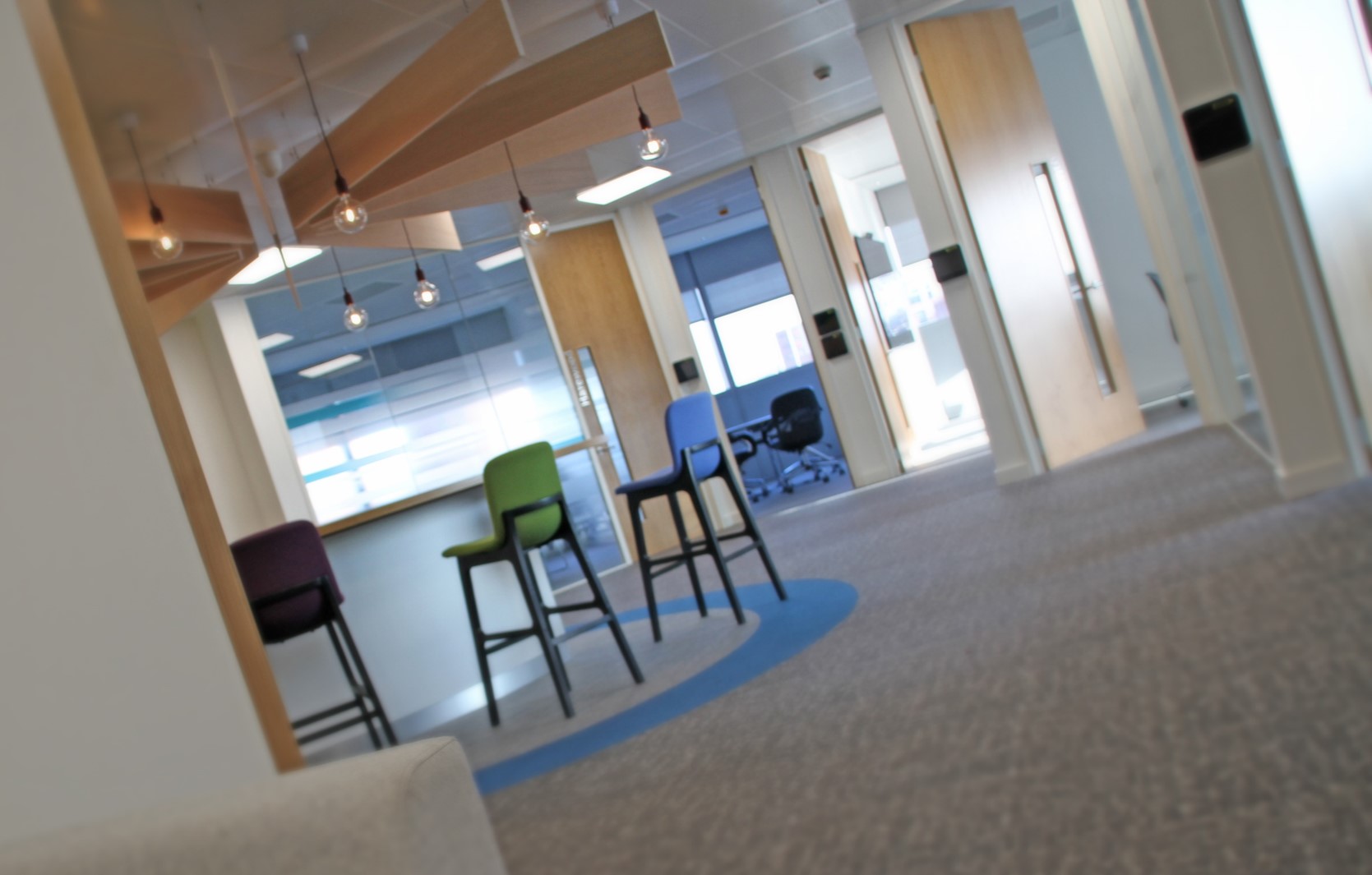 We were tasked with producing a modern, refreshed scheme that mirrored other Weightmans workspaces around the country but stuck to a pre-indicated layout and very clear brand guidelines. The new workspace consists of agile workstations – including standing desks, a client suite, quiet rooms, meeting rooms, catering facilities and a social hub.