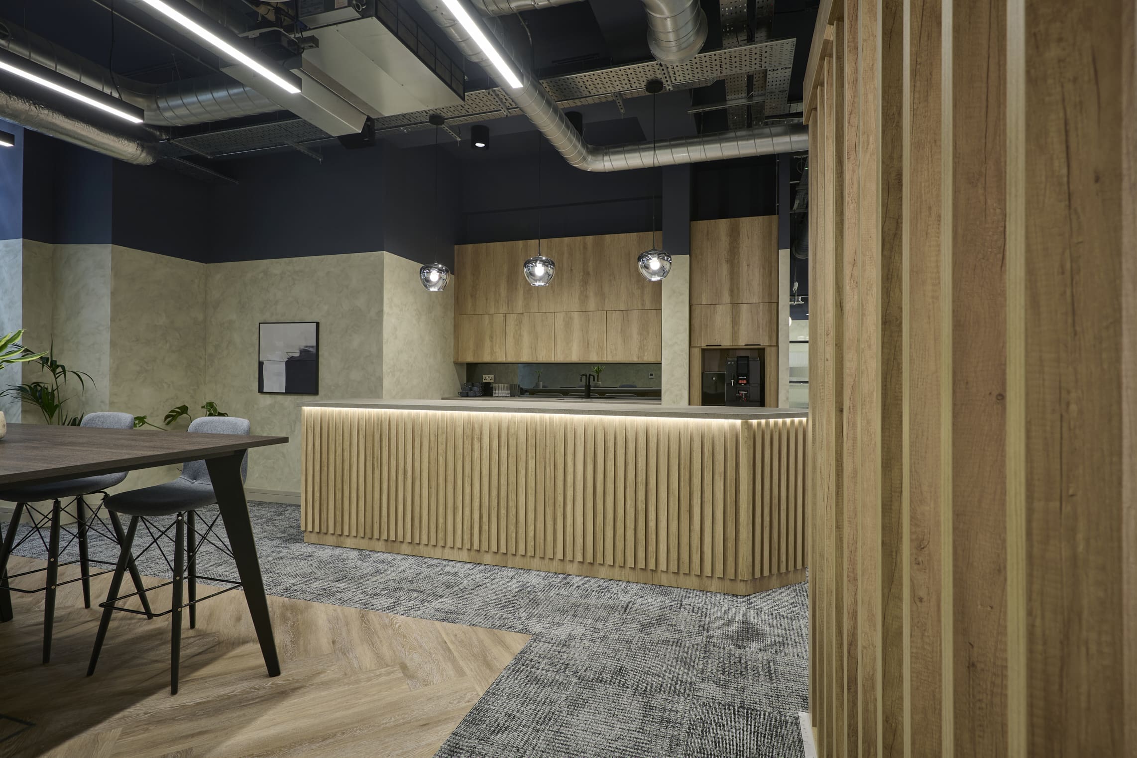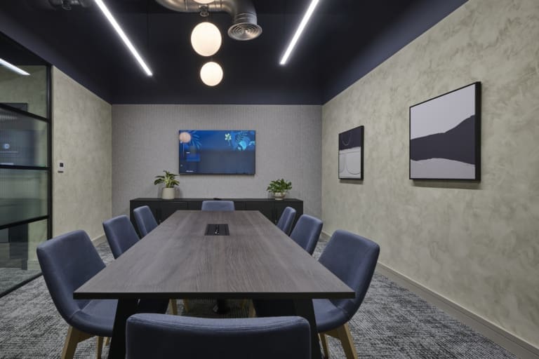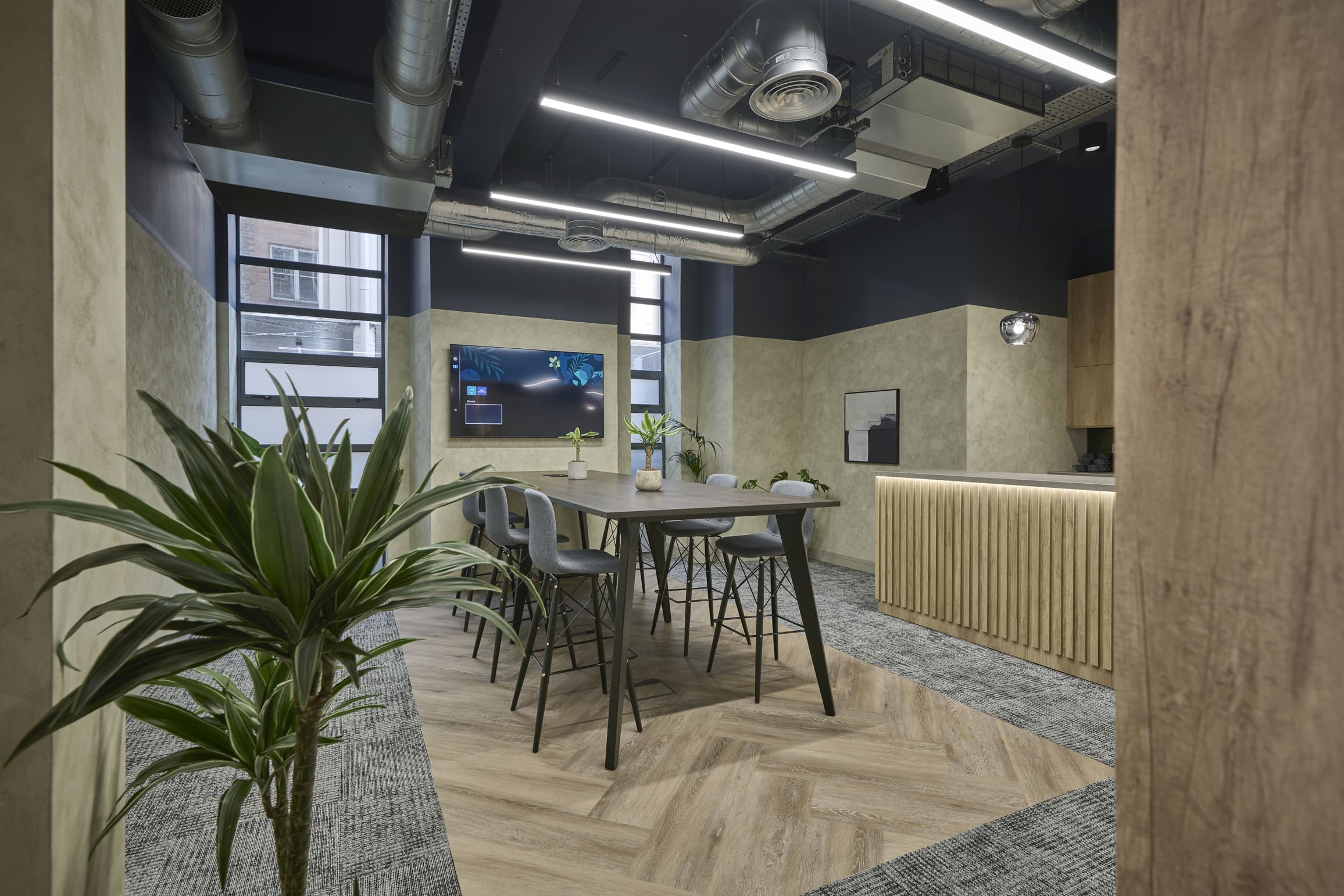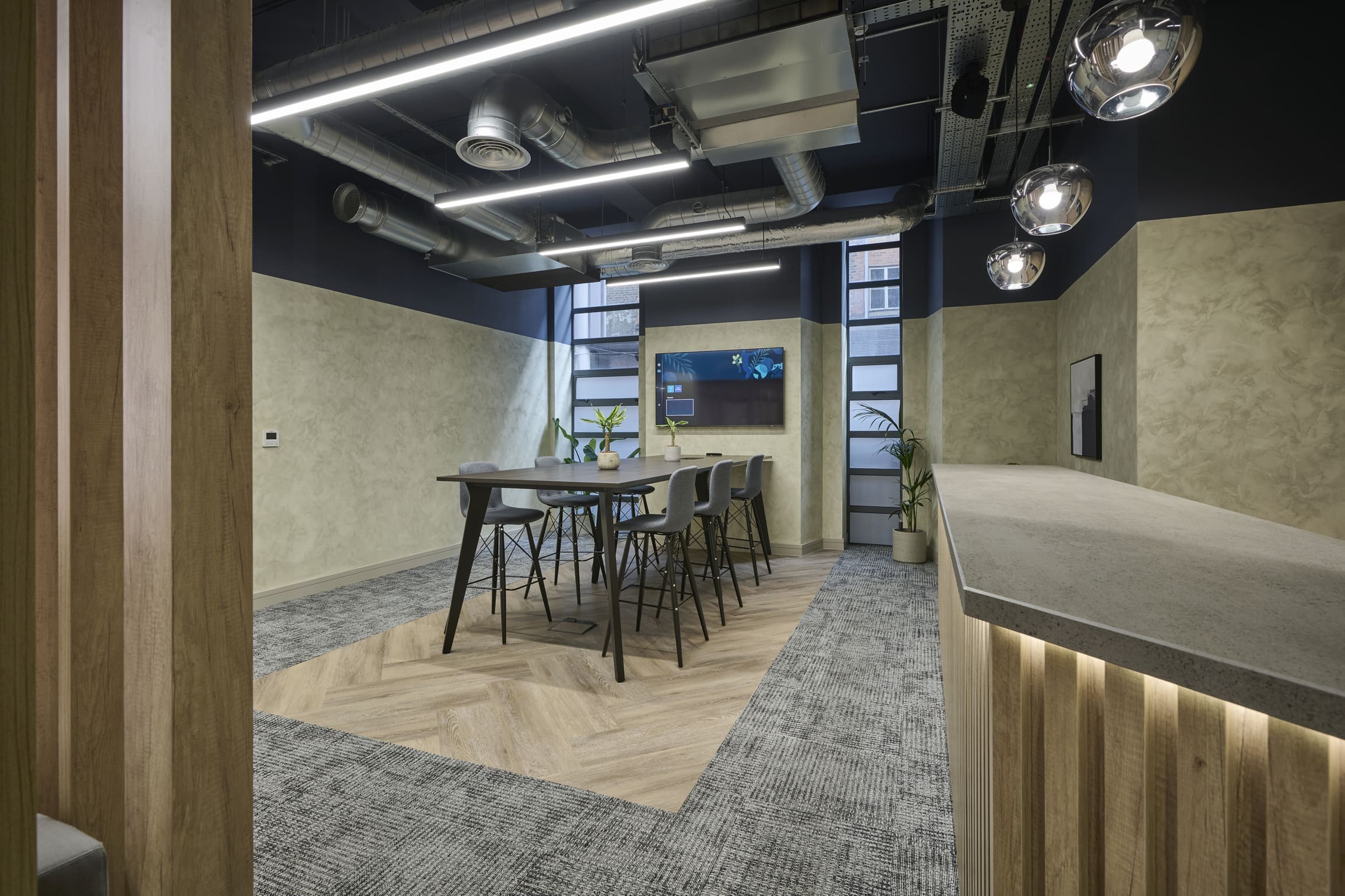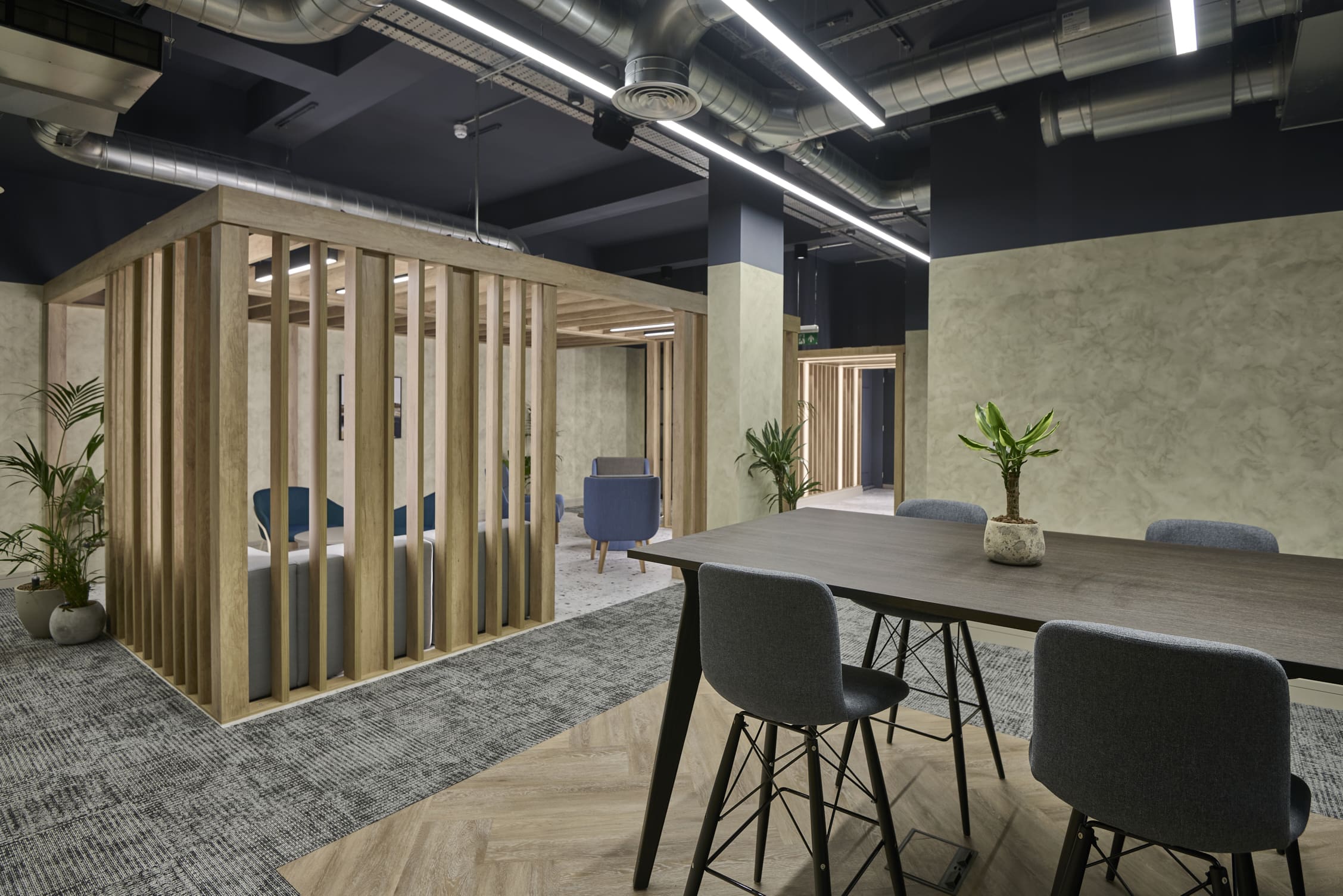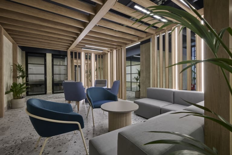 The Ben Johnson Interiors delivery team got to work stripping the space back to its concrete shell. The exposed soffit was retained and painted dark blue to maintain the ceiling height and industrial feel. The lounge has limited natural light, so the designer selected warm materials such as timber to frame and divide spaces, with contrasting industrial finishes such as the exposed services and Crittall-style glazing to allow light to permeate through the space. Concrete paint was used to frame the space below the painted blue soffit, creating an interesting border feature on the exposed columns. Feature lighting and acoustic baffles were utilised throughout the scheme to define areas, soften the environment, and improve acoustics. The lounge was zoned to create multiple levels of enclosure and privacy for various working conditions: quiet spaces for private meetings and team calls, semi-private spaces for informal meetings, and open-plan kitchen areas for social interaction. The zones were created through a mixture of partitioning with Crittall-style doors and a bespoke timber pergola, which was a key central joinery feature within the design. The open plan included a bistro-style kitchen with a complementary coffee machine, designed to encourage tenants to meet and interact. The space also has the potential to be used as an event space, with media walls installed throughout the facility. All meeting rooms are bookable through the tenant website or via a localised iPad outside each room, which clearly shows if the meeting rooms are in use or reserved. Zoning was further achieved through carefully selected lighting, feature flooring, and furniture. Rich but calming shades of blue were chosen for soft furnishings and accents of colour throughout the interior.