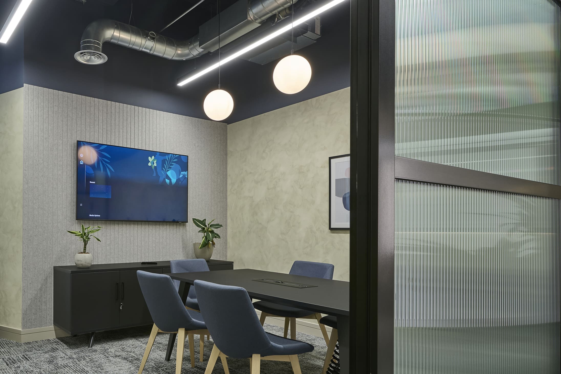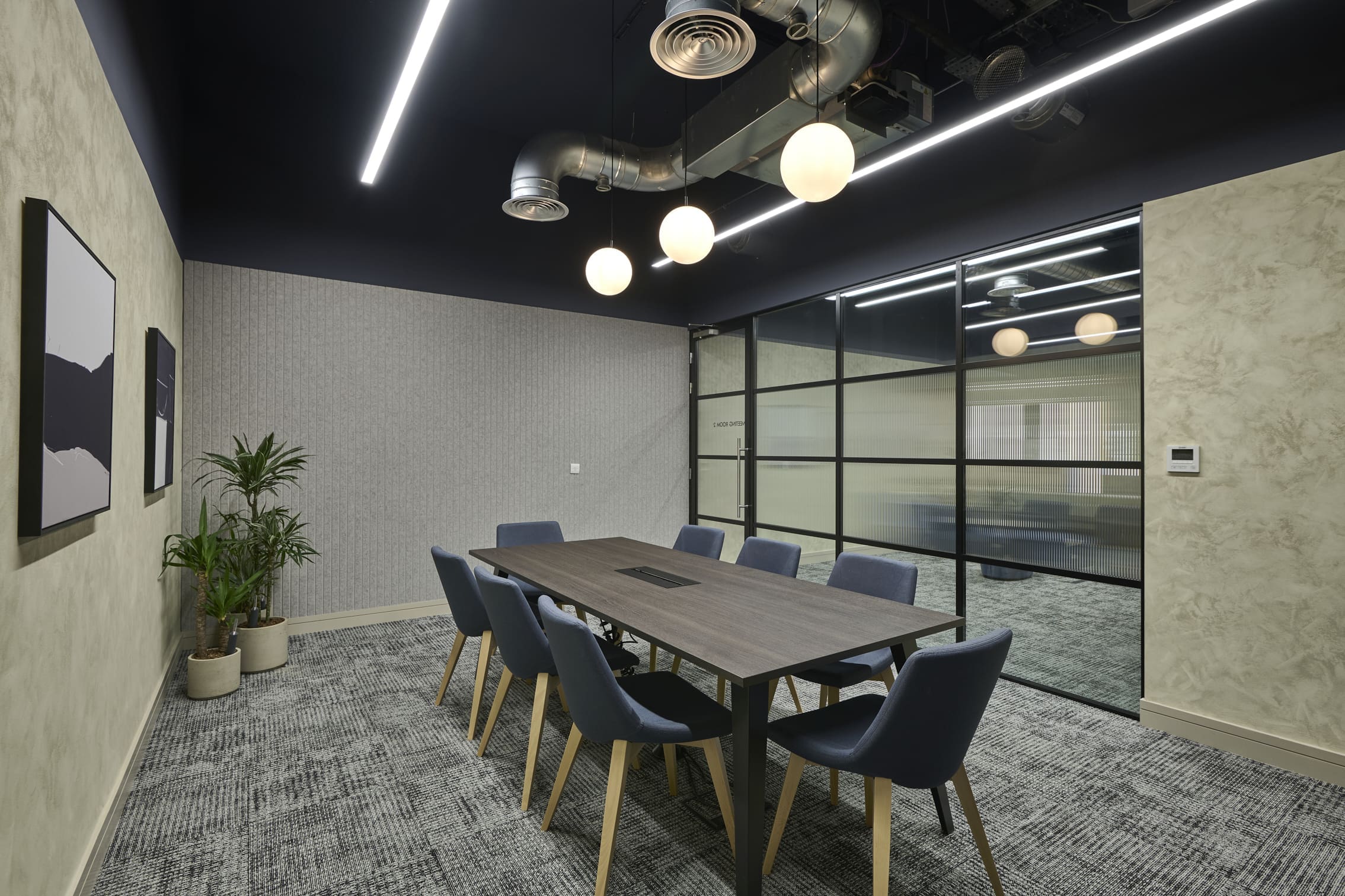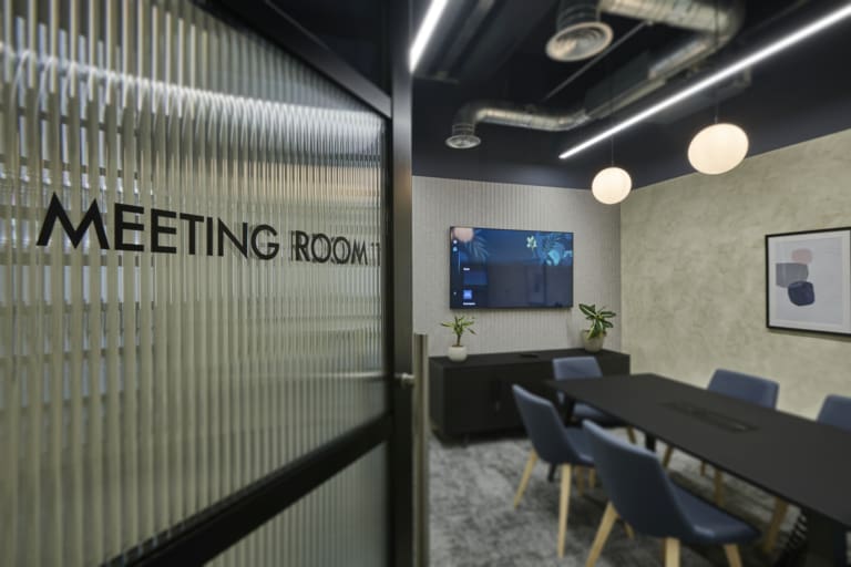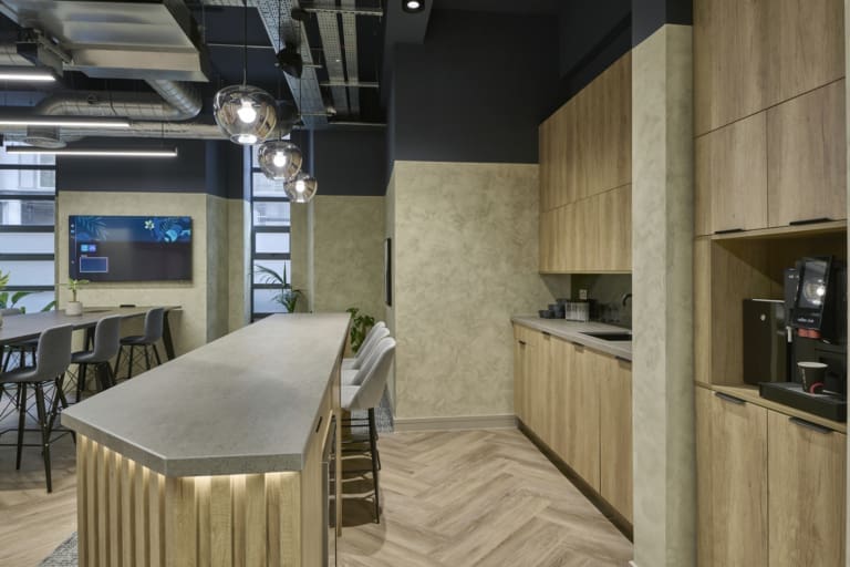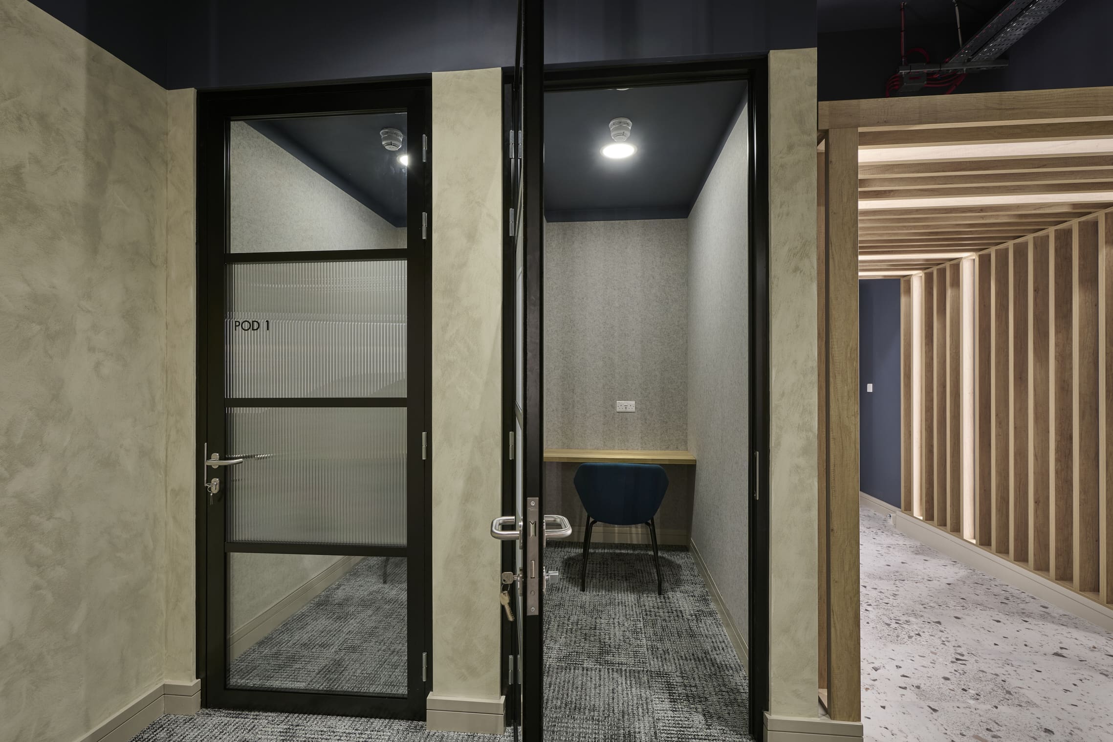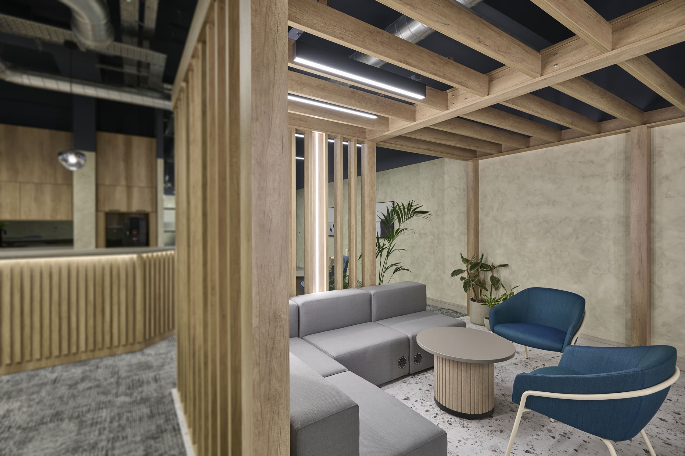 The Ben Johnson Interiors delivery team got to work stripping the space back to its concrete shell. The exposed soffit was retained and painted dark blue to maintain the ceiling height and industrial feel. The lounge has limited natural light, so the designer selected warm materials such as timber to frame and divide spaces, with contrasting industrial finishes such as the exposed services and Crittall-style glazing to allow light to permeate through the space. Concrete paint was used to frame the space below the painted blue soffit, creating an interesting border feature on the exposed columns. Feature lighting and acoustic baffles were utilised throughout the scheme to define areas, soften the environment, and improve acoustics. The lounge was zoned to create multiple levels of enclosure and privacy for various working conditions: quiet spaces for private meetings and team calls, semi-private spaces for informal meetings, and open-plan kitchen areas for social interaction. The zones were created through a mixture of partitioning with Crittall-style doors and a bespoke timber pergola, which was a key central joinery feature within the design. The open plan included a bistro-style kitchen with a complementary coffee machine, designed to encourage tenants to meet and interact. The space also has the potential to be used as an event space, with media walls installed throughout the facility. All meeting rooms are bookable through the tenant website or via a localised iPad outside each room, which clearly shows if the meeting rooms are in use or reserved. Zoning was further achieved through carefully selected lighting, feature flooring, and furniture. Rich but calming shades of blue were chosen for soft furnishings and accents of colour throughout the interior.