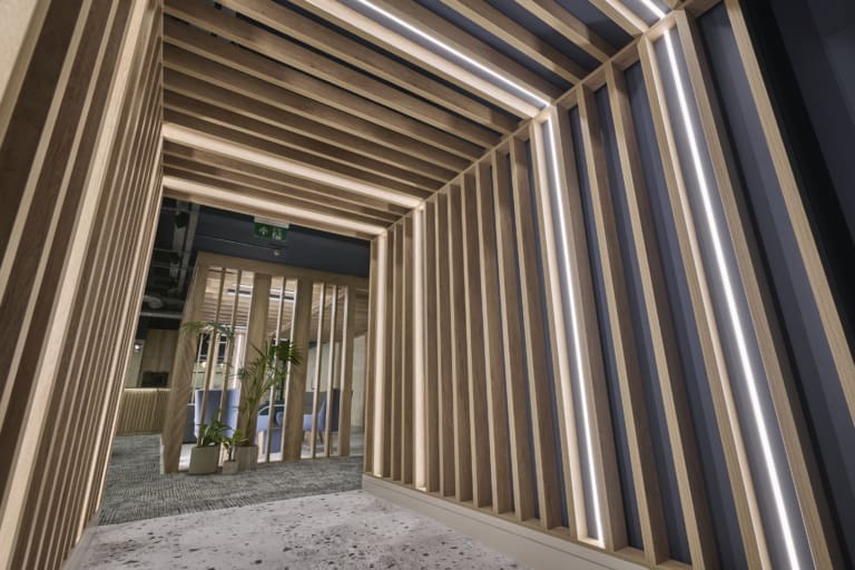Grey Street has a chic new Business Lounge/Shared Collaboration Space to rival any other. The lounge is cleverly linked to the existing reception through a timber tunnel with integrated feature lighting, which directs the occupiers into the business lounge — a lovely visual cue that it is open and ready for business. A great space to attract and retain future occupiers.