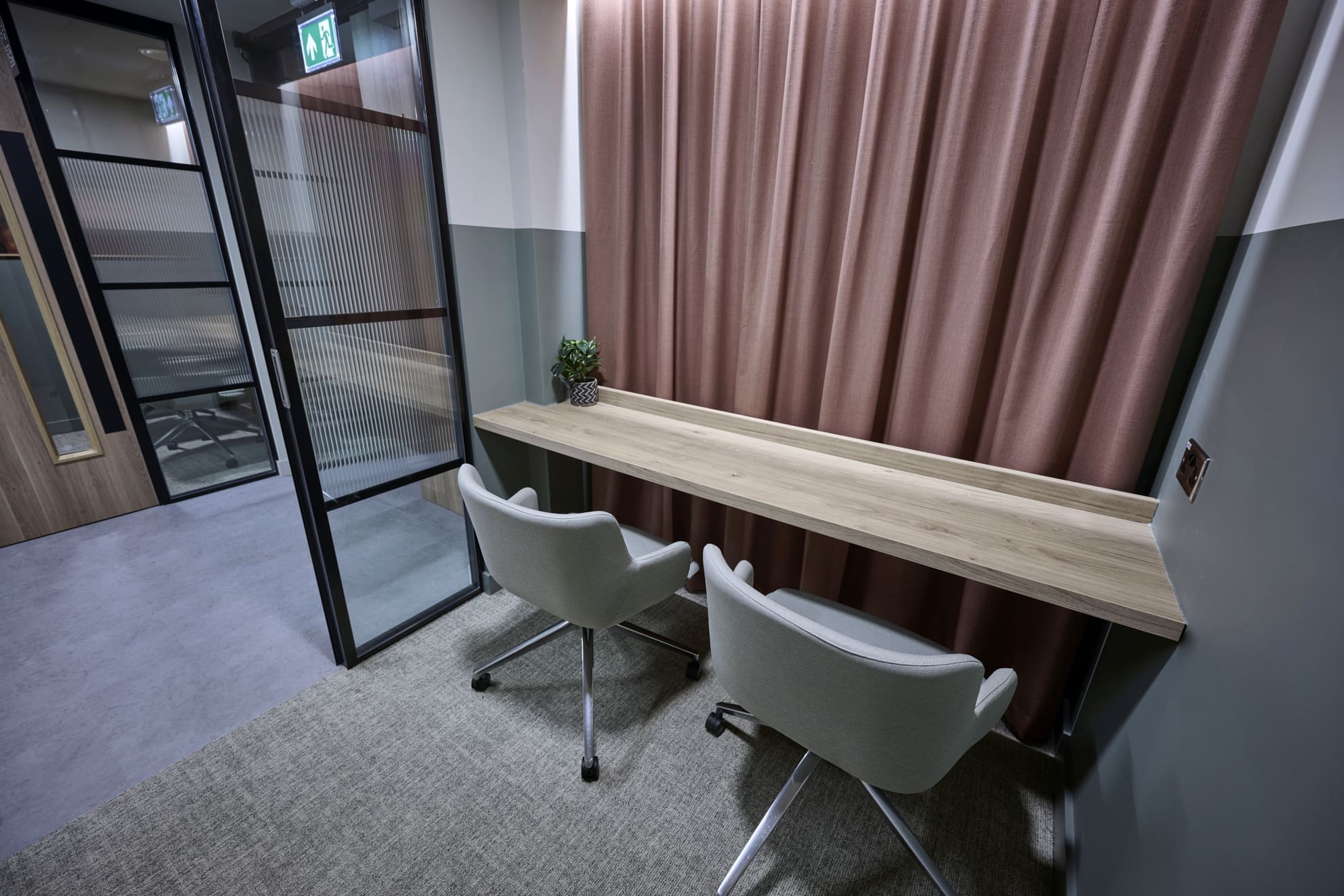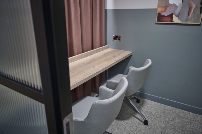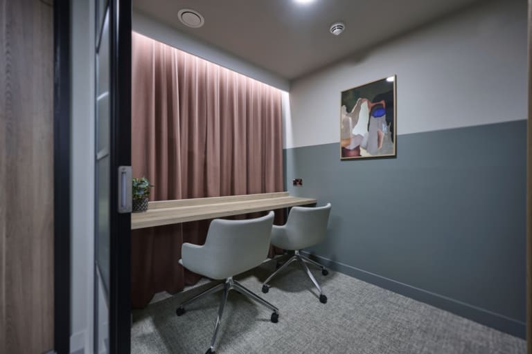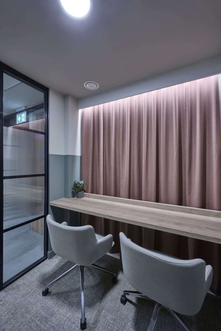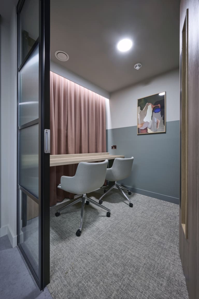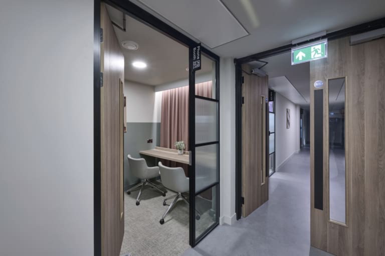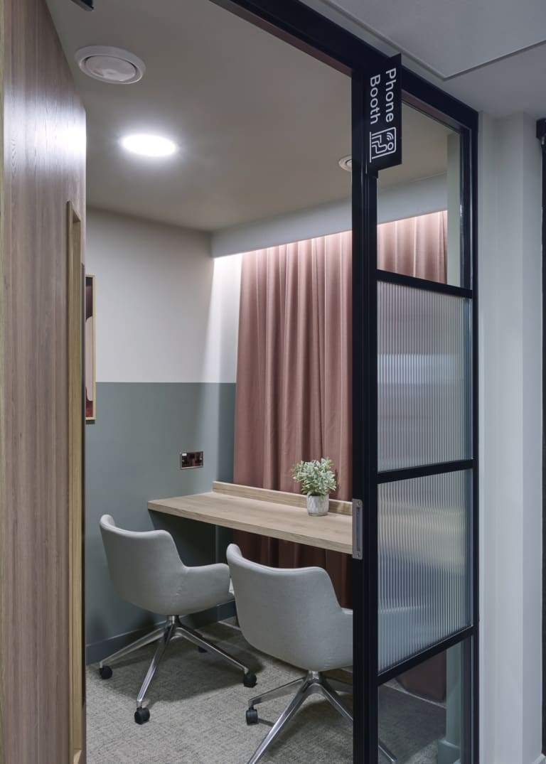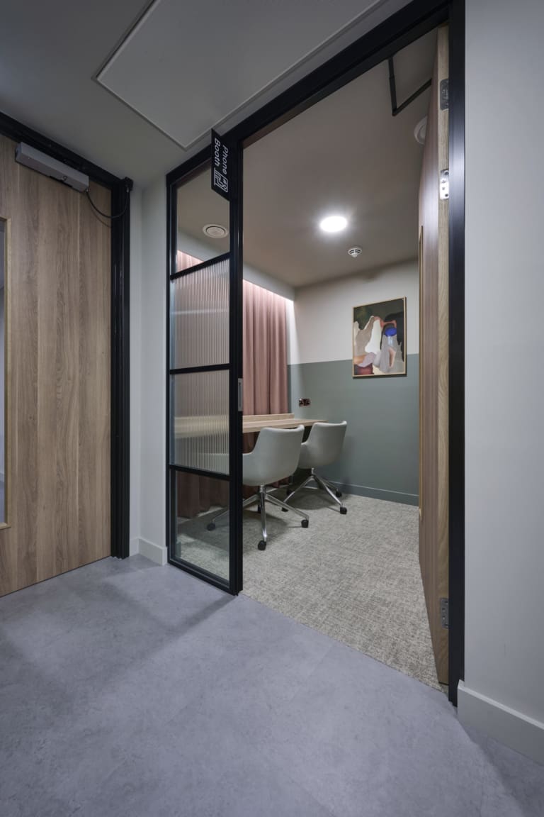 Platform is a busy, city-centre occupied office building located directly above Leeds railway station, so meticulous planning was essential. We worked within strict operational constraints, scheduling noisy works outside of business hours and managing all deliveries through limited out-of-hours slots. The project began with a complete strip-out of the existing space, including the sustainable recycling of redundant glazing. A Bruntwood Scitech coworking space is never a standard or characterless fit-out—it is always crafted to a high specification.At Platform, the walls feature an on-trend border in neutral tones of green, cream, and burnt orange, creating a warm and contemporary aesthetic. Acoustic performance was a key priority: all solid partitions were installed slab-to-slab to achieve excellent sound separation, and where glazing was required, acoustic-grade crittal glazing was used. Continuing the acoustic theme, solid oak doors with vision panels were fitted throughout, complemented by bespoke signage to support intuitive wayfinding. A strong sense of community shapes every Bruntwood Scitech workspace, and Platform embodies this through its welcoming lounge area, shared welfare kitchen, and softlit phone booths with curtains for added privacy and comfort. Every detail was selected to create a warm, functional, and enjoyable environment for its customer.
