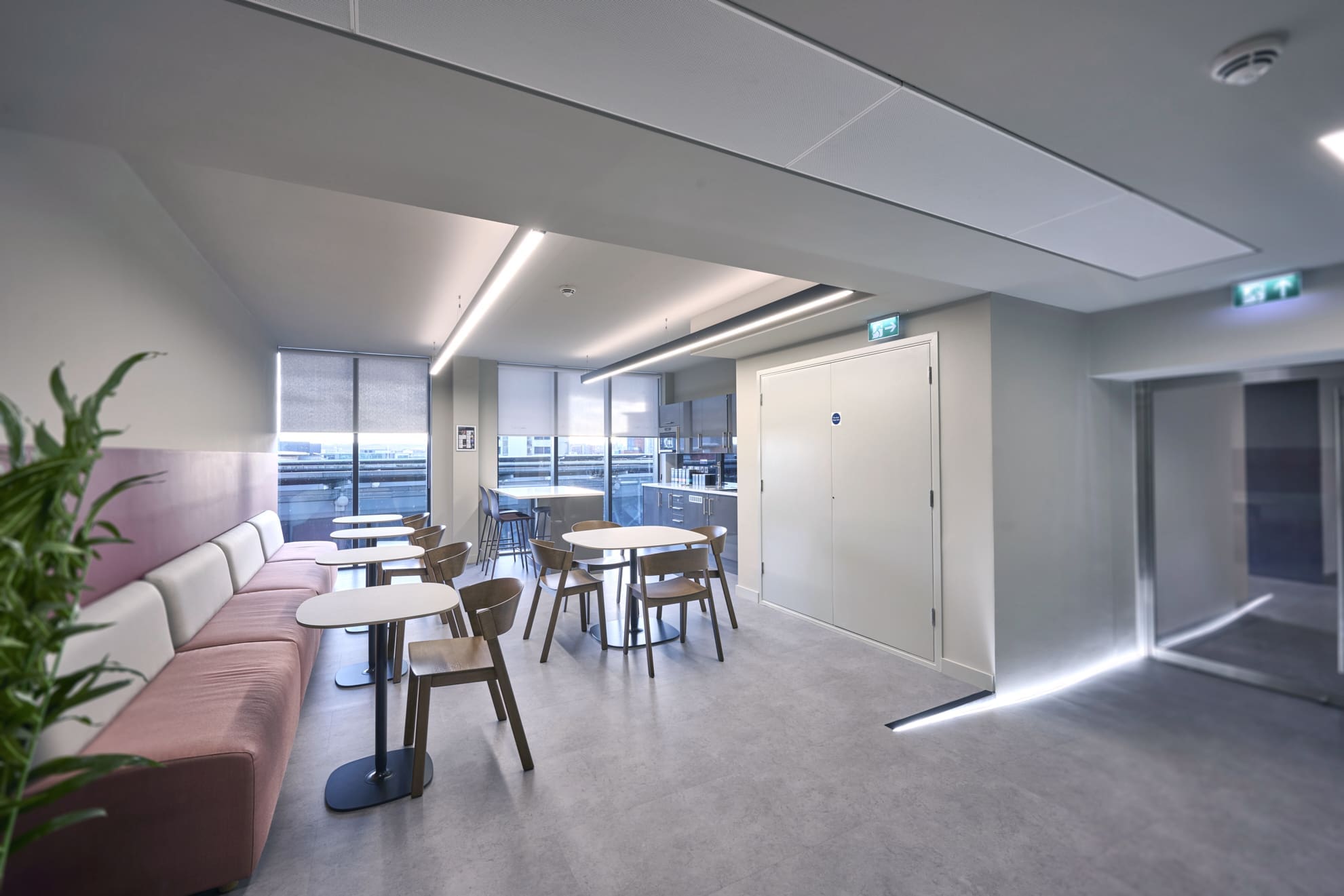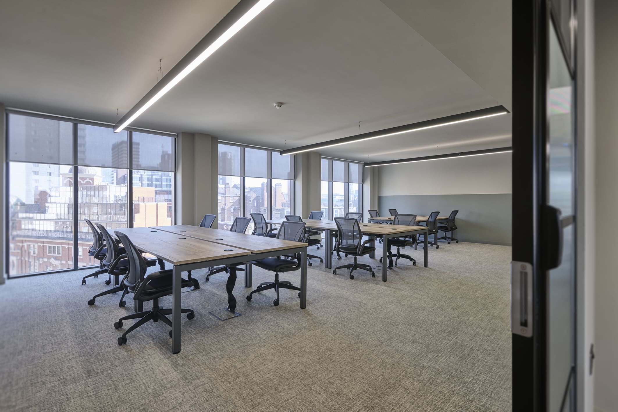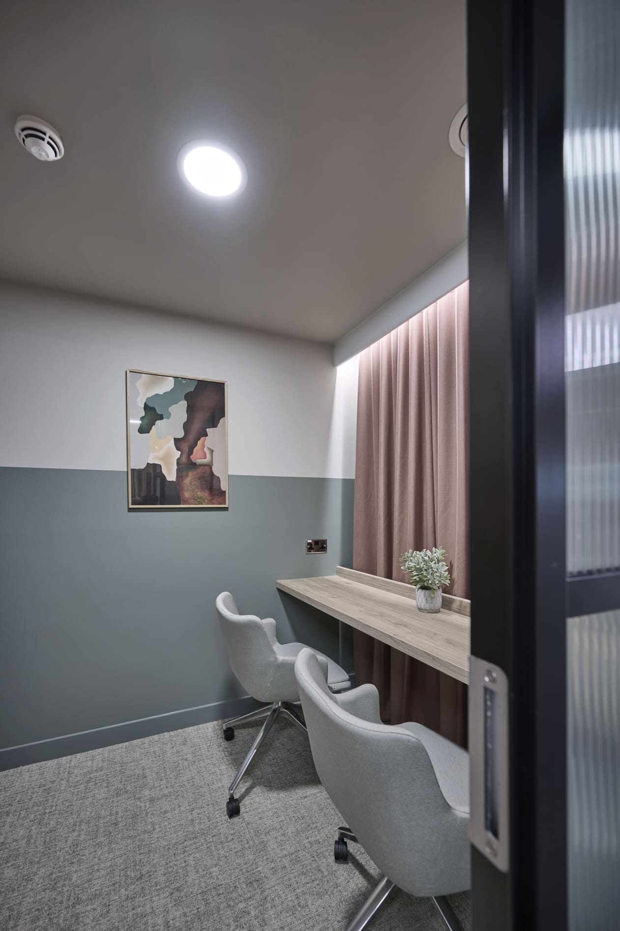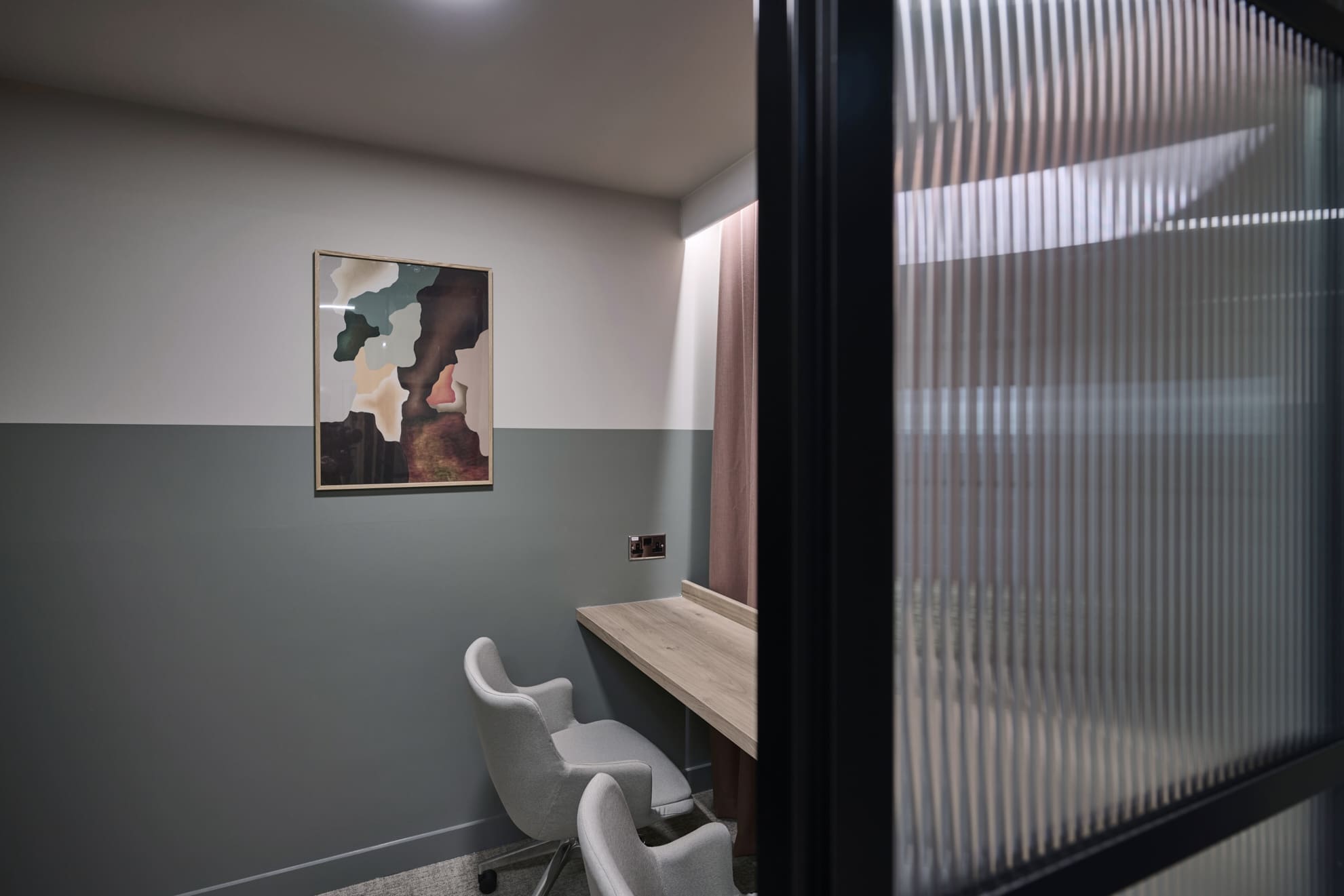 Platform is a busy, city-centre occupied office building located directly above Leeds railway station, so meticulous planning was essential. We worked within strict operational constraints, scheduling noisy works outside of business hours and managing all deliveries through limited out-of-hours slots. The project began with a complete strip-out of the existing space, including the sustainable recycling of redundant glazing. A Bruntwood Scitech coworking space is never a standard or characterless fit-out—it is always crafted to a high specification.At Platform, the walls feature an on-trend border in neutral tones of green, cream, and burnt orange, creating a warm and contemporary aesthetic. Acoustic performance was a key priority: all solid partitions were installed slab-to-slab to achieve excellent sound separation, and where glazing was required, acoustic-grade crittal glazing was used. Continuing the acoustic theme, solid oak doors with vision panels were fitted throughout, complemented by bespoke signage to support intuitive wayfinding. A strong sense of community shapes every Bruntwood Scitech workspace, and Platform embodies this through its welcoming lounge area, shared welfare kitchen, and softlit phone booths with curtains for added privacy and comfort. Every detail was selected to create a warm, functional, and enjoyable environment for its customer.