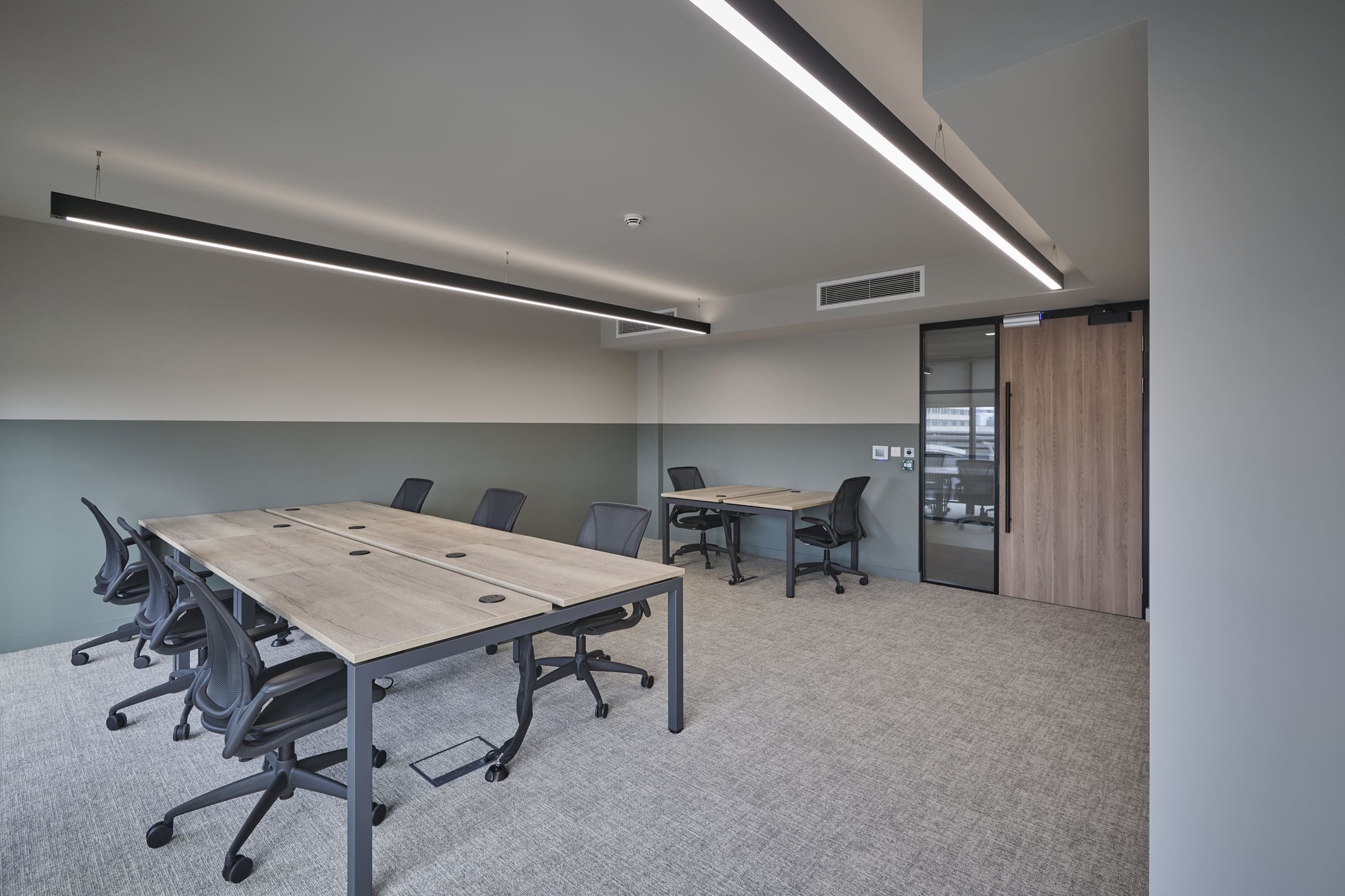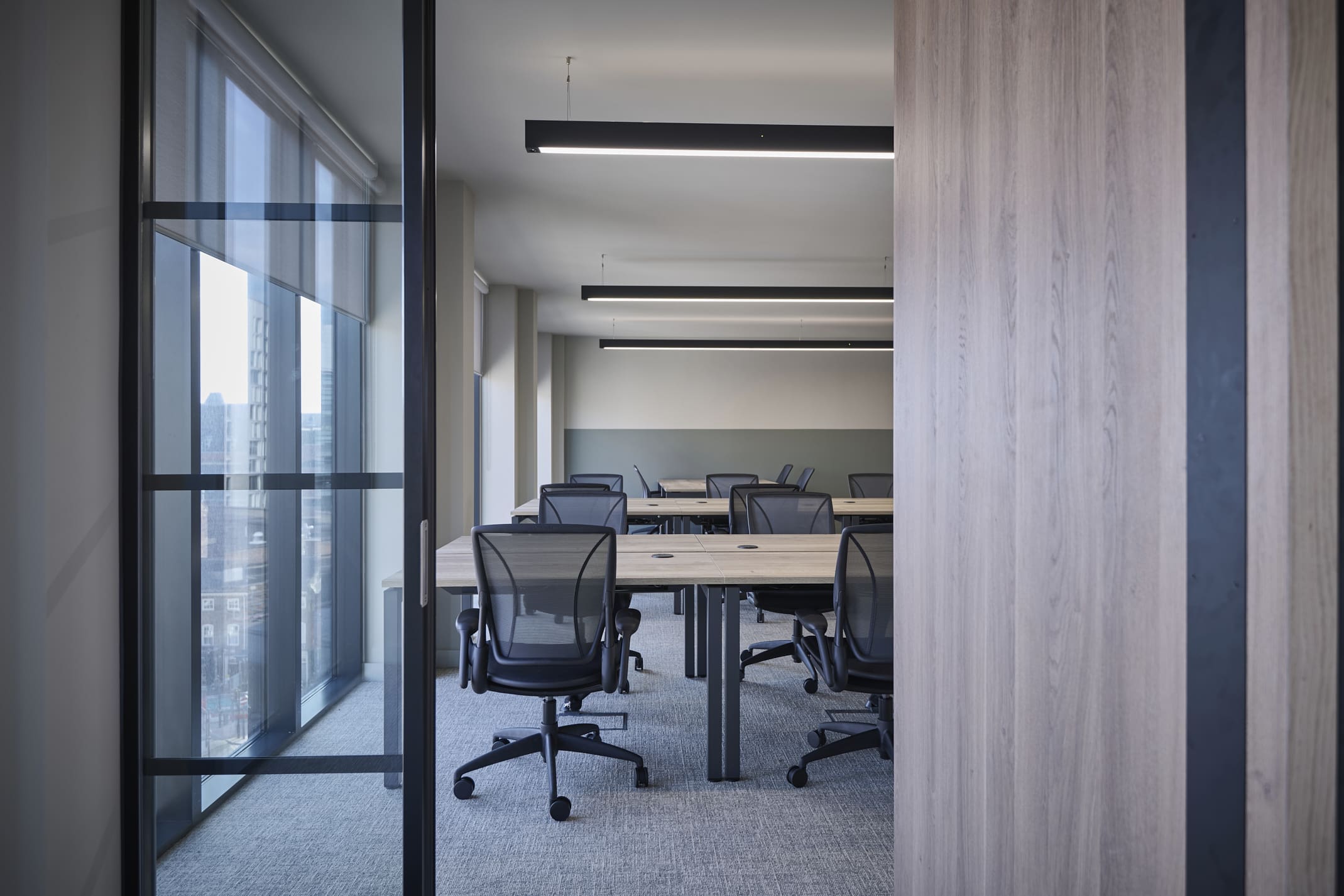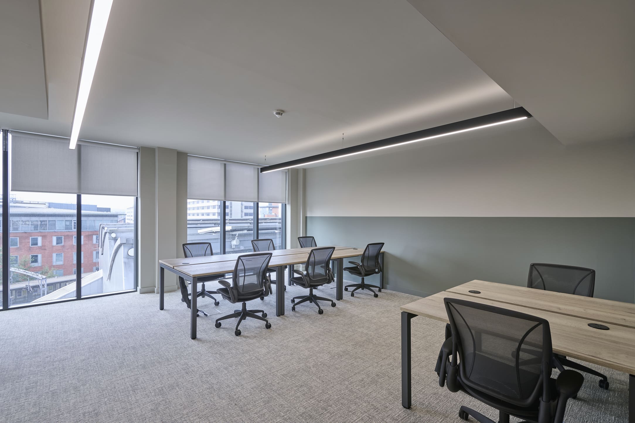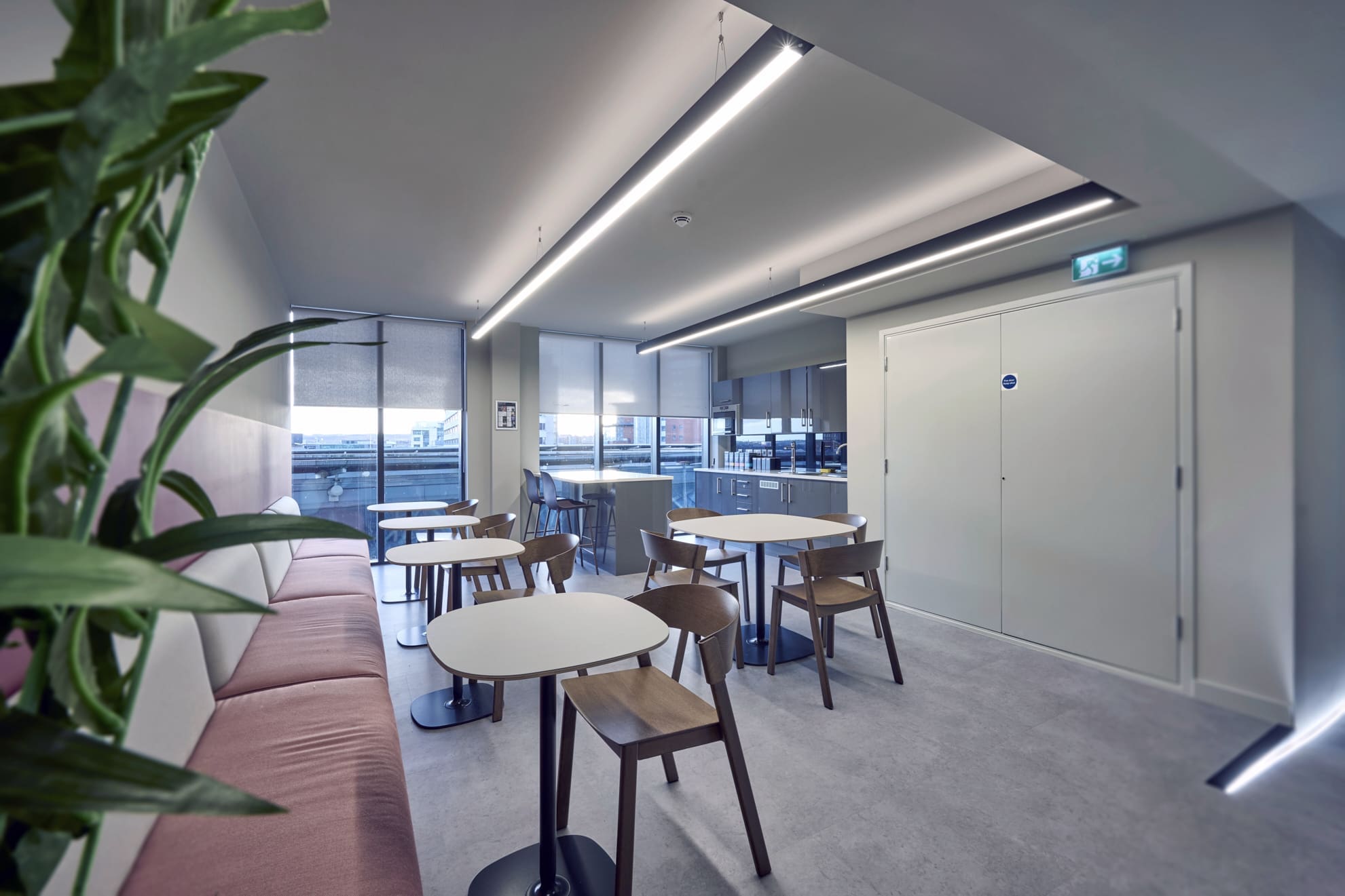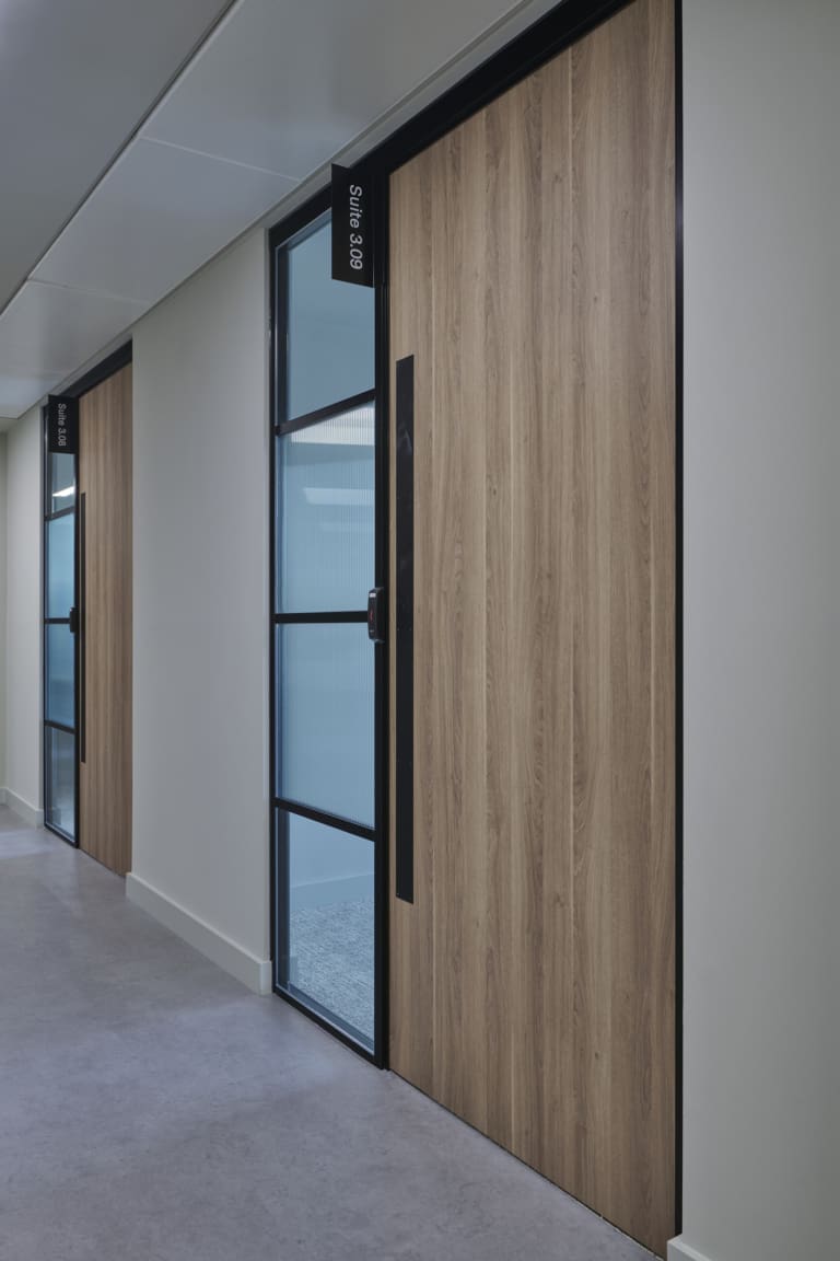 Platform is a busy, city-centre occupied office building located directly above Leeds railway station, so meticulous planning was essential. We worked within strict operational constraints, scheduling noisy works outside of business hours and managing all deliveries through limited out-of-hours slots. The project began with a complete strip-out of the existing space, including the sustainable recycling of redundant glazing. A Bruntwood Scitech coworking space is never a standard or characterless fit-out—it is always crafted to a high specification.At Platform, the walls feature an on-trend border in neutral tones of green, cream, and burnt orange, creating a warm and contemporary aesthetic. Acoustic performance was a key priority: all solid partitions were installed slab-to-slab to achieve excellent sound separation, and where glazing was required, acoustic-grade crittal glazing was used. Continuing the acoustic theme, solid oak doors with vision panels were fitted throughout, complemented by bespoke signage to support intuitive wayfinding. A strong sense of community shapes every Bruntwood Scitech workspace, and Platform embodies this through its welcoming lounge area, shared welfare kitchen, and softlit phone booths with curtains for added privacy and comfort. Every detail was selected to create a warm, functional, and enjoyable environment for its customer.