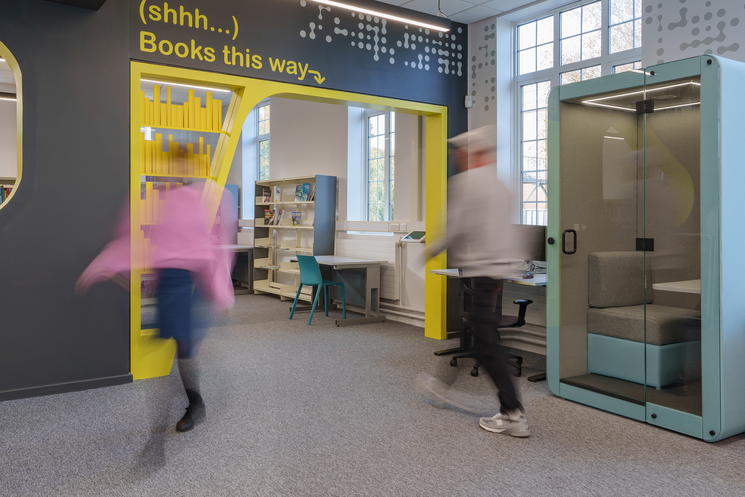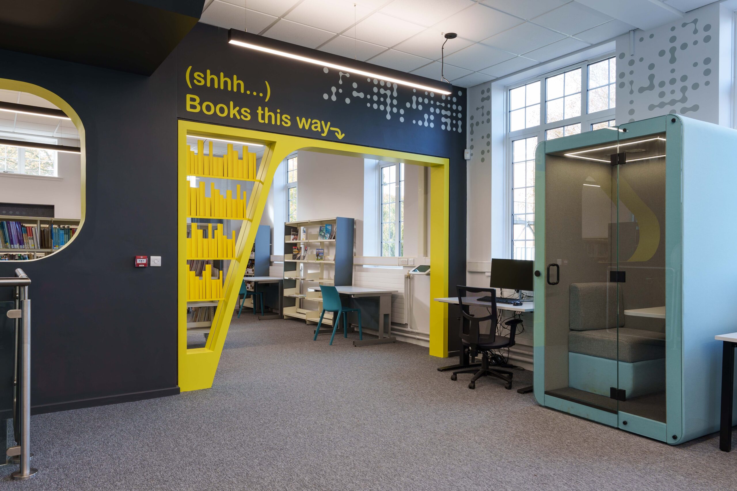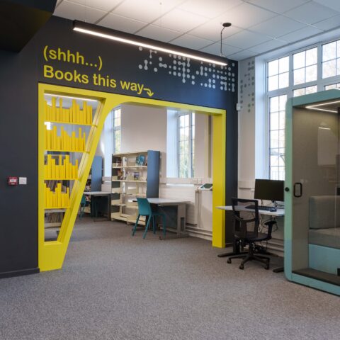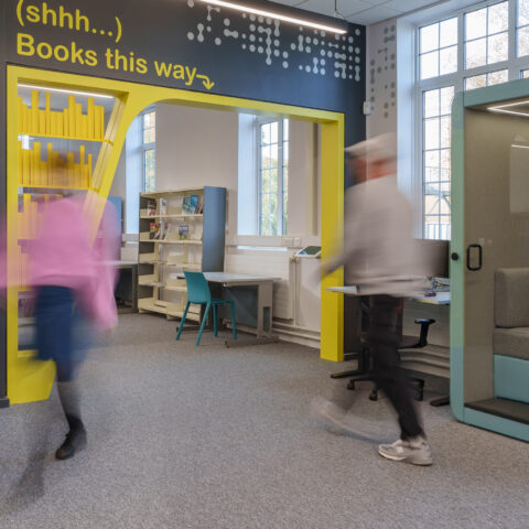 Furniture is adaptable and comfortable, supporting both individual study and small-group collaboration. Technology is integrated in a way that provides access to digital resources without creating sensory overload. Biophilic elements, natural light, and calming colours further support focus, wellbeing, and engagement.